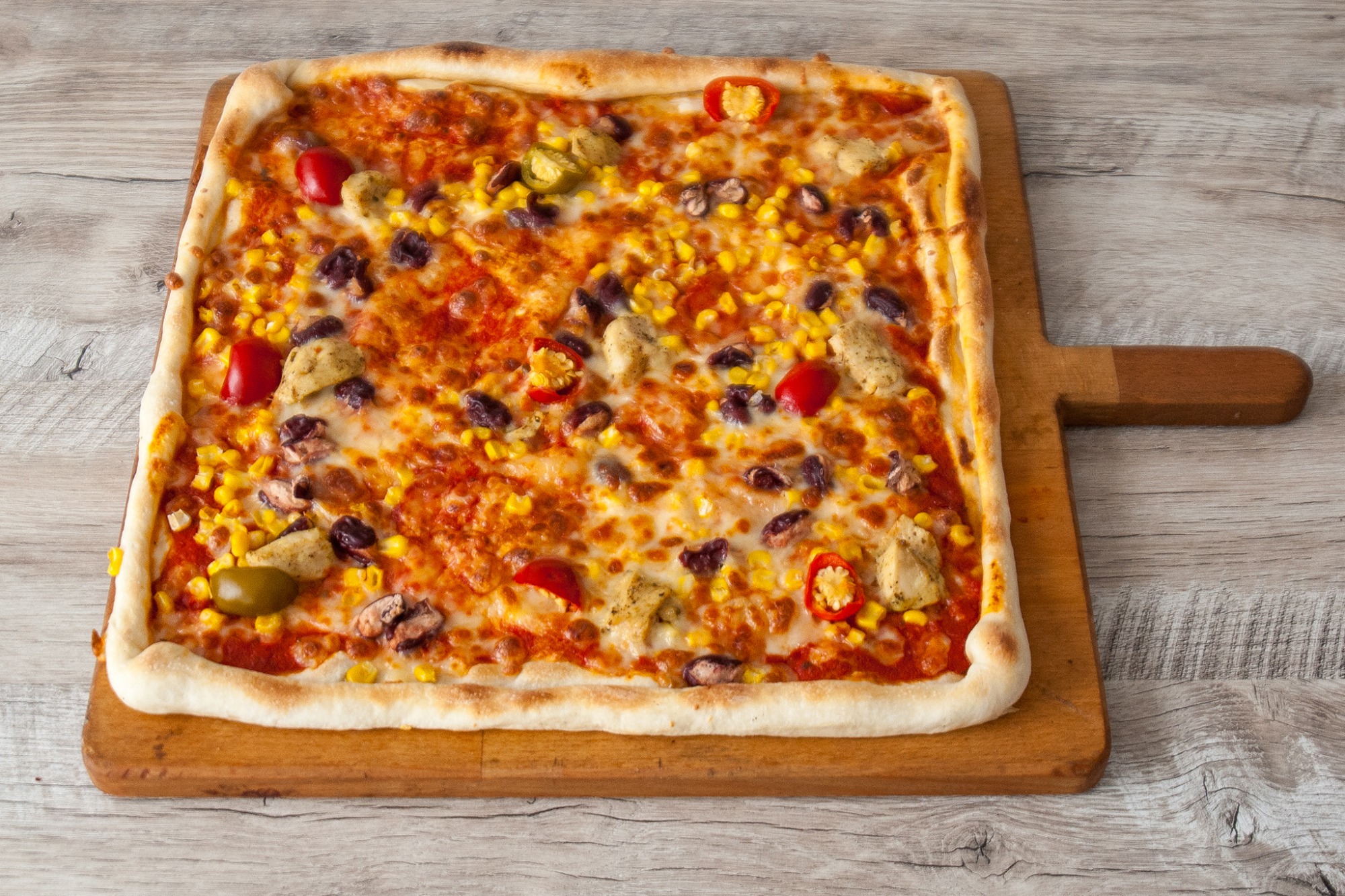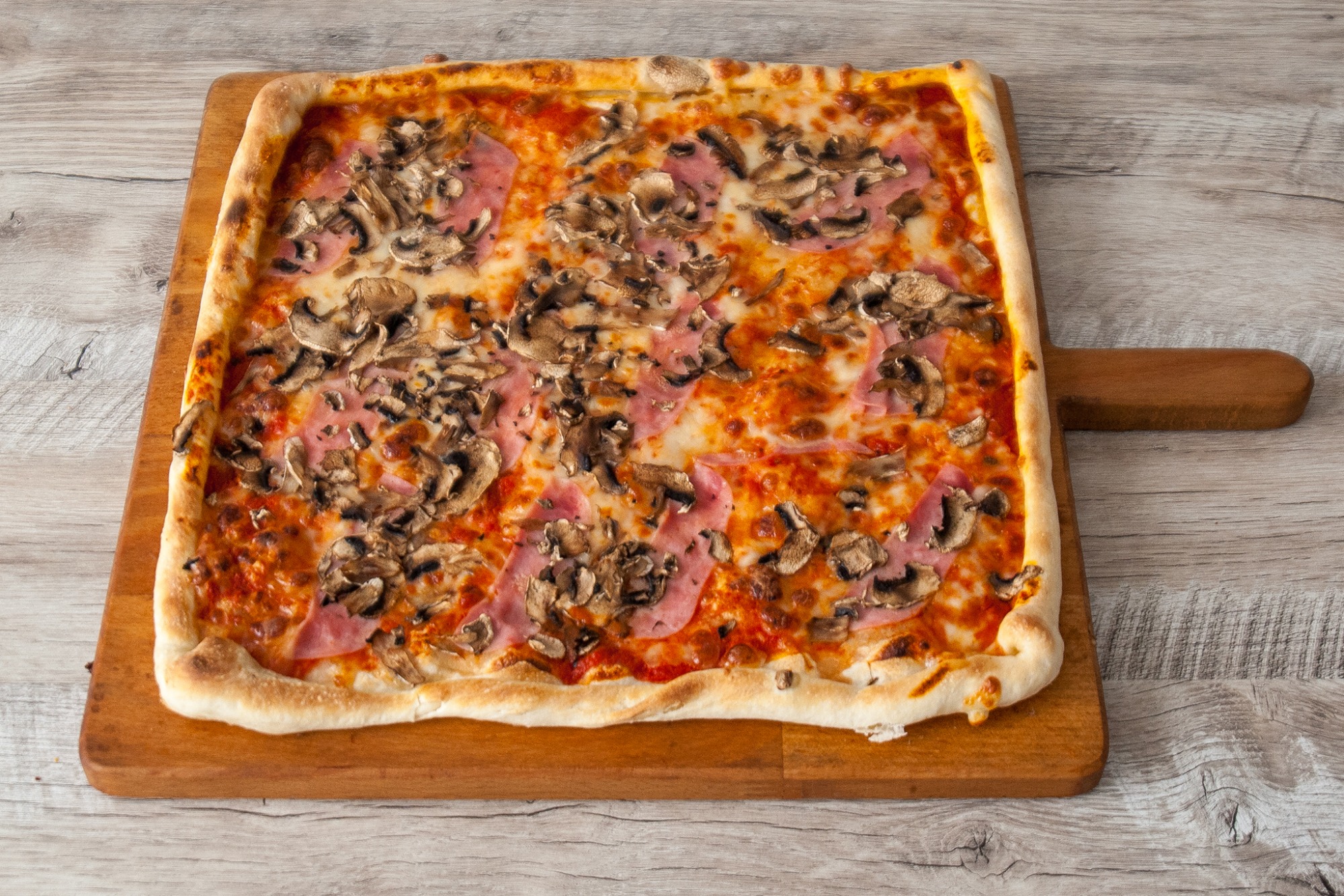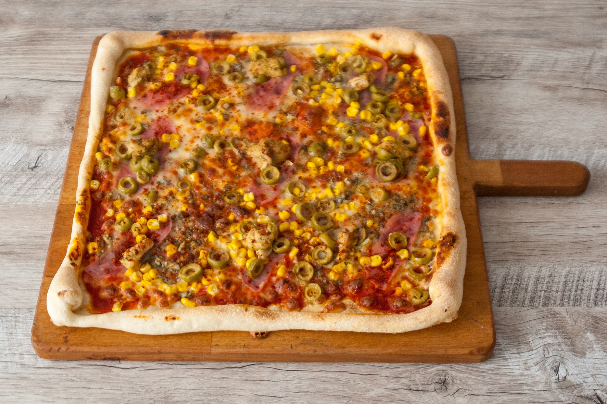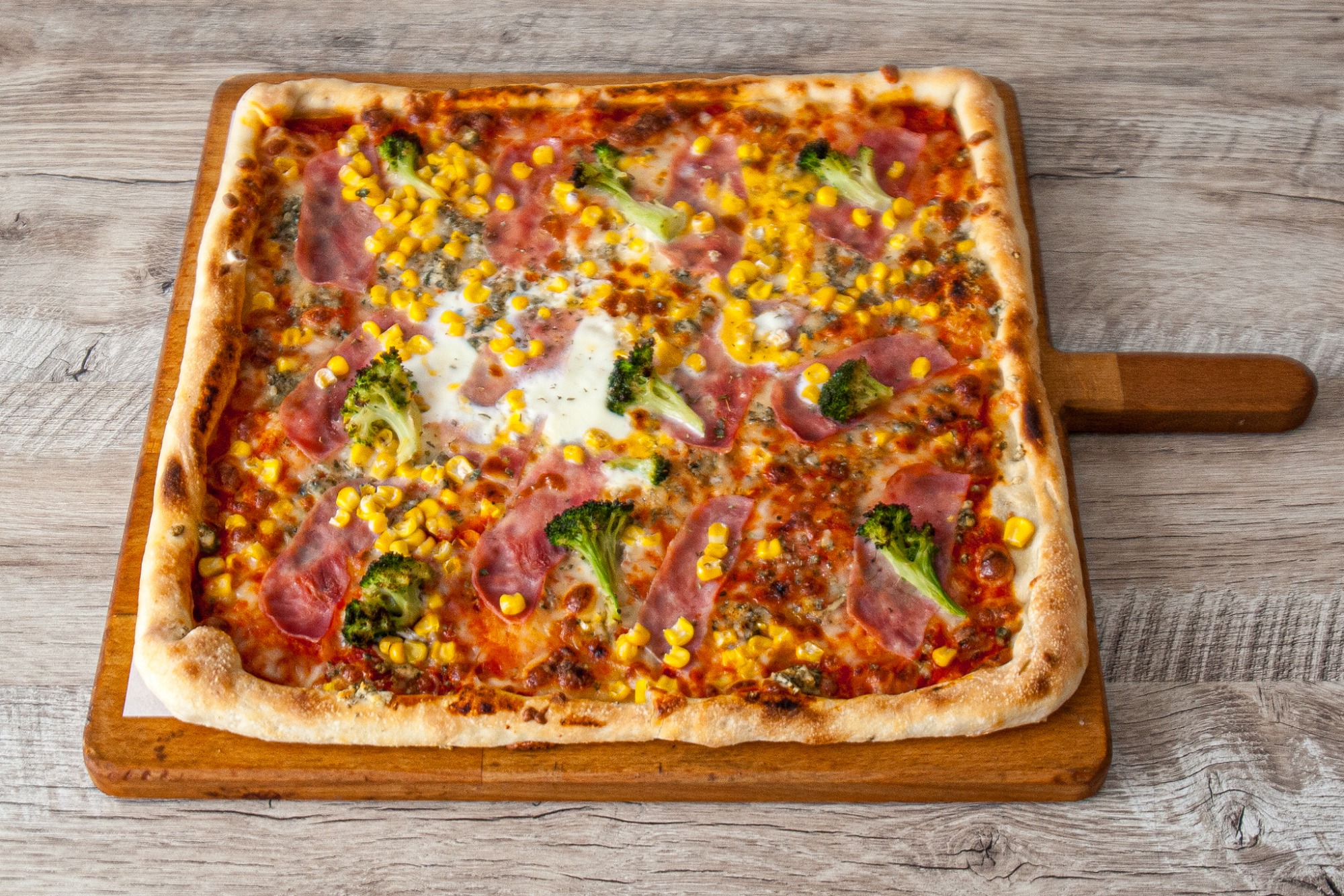 Pizza PROSCIUTTO s kukuricou – paradajkový základ, mozzarella, šunka a kukurica