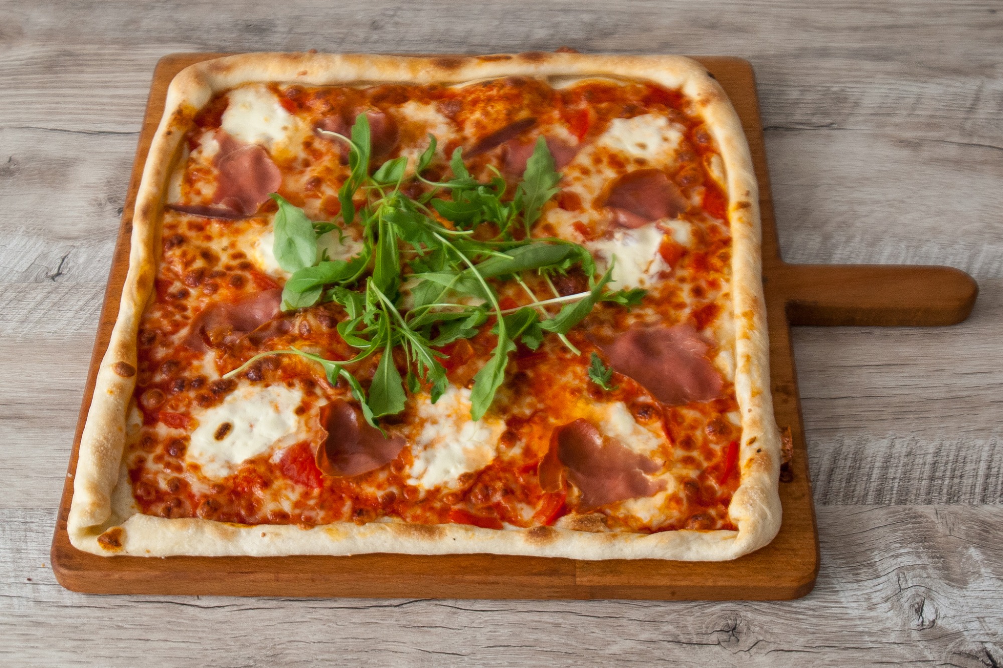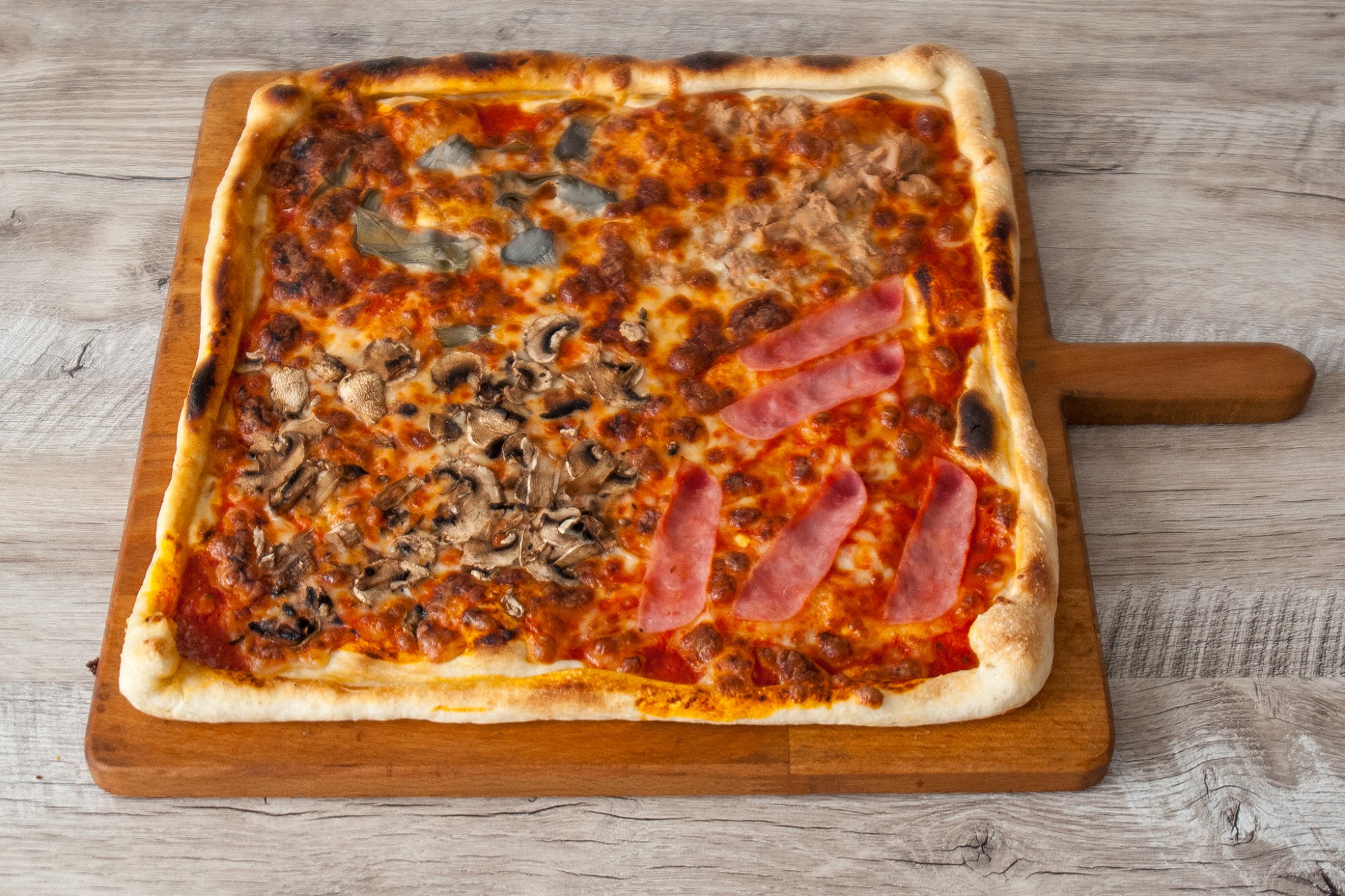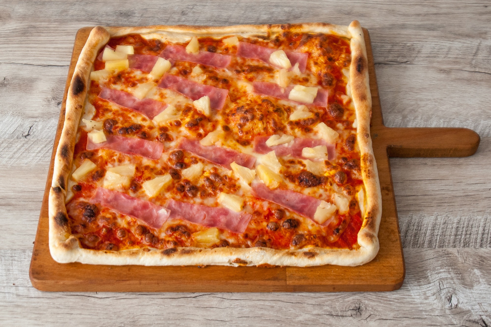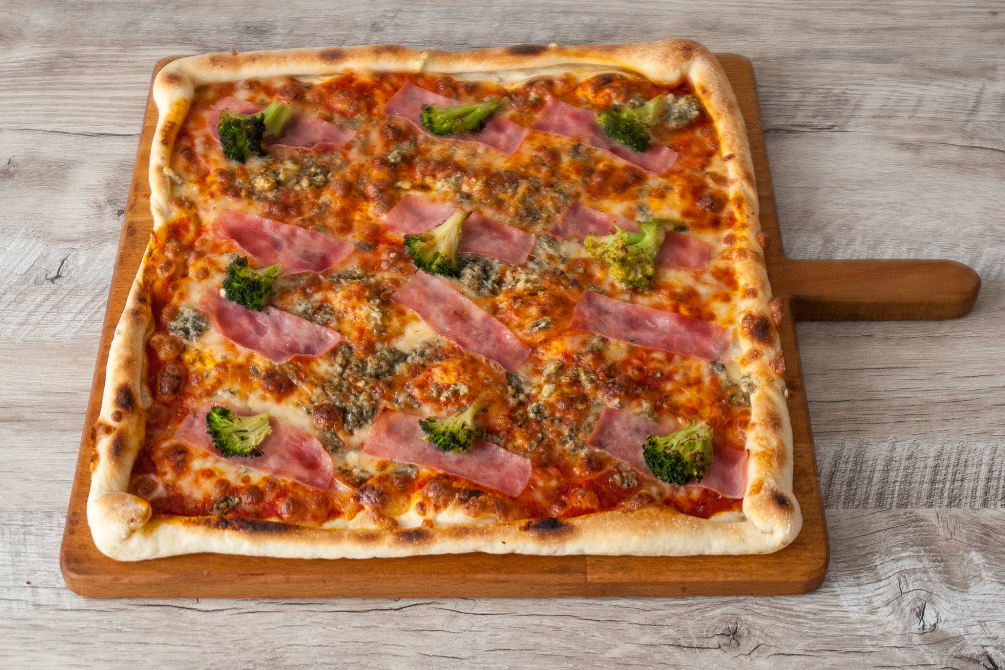 Pizza PROSCIUTTO s kukuricou – paradajkový základ, mozzarella, šunka a kukurica