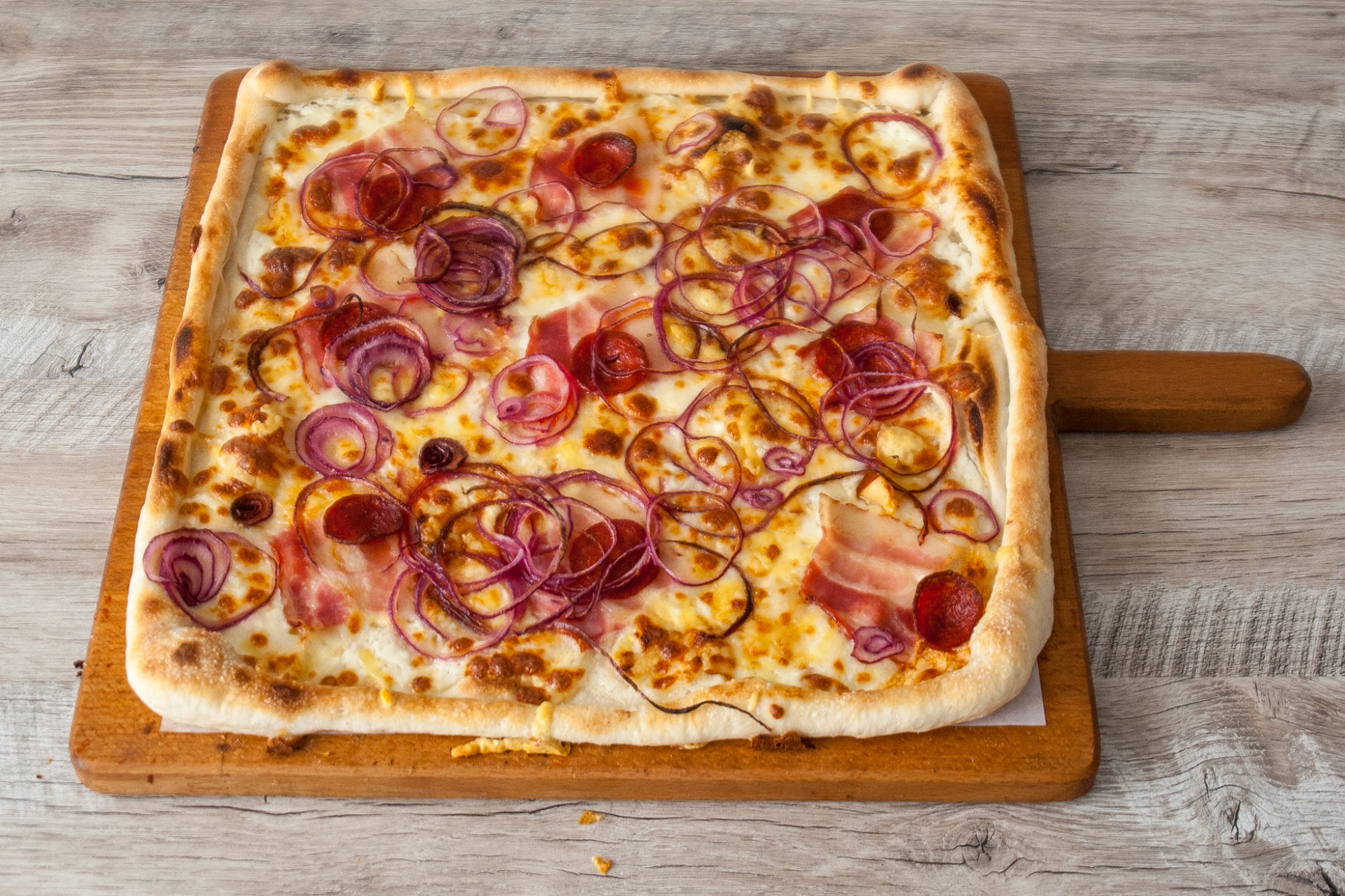 čierna žemľa, 100% hovädzie mäso, červená cibuľa, rajčina, rukola, slaninka, cheddar, cibuľové krúžky, slaninová omáčka,