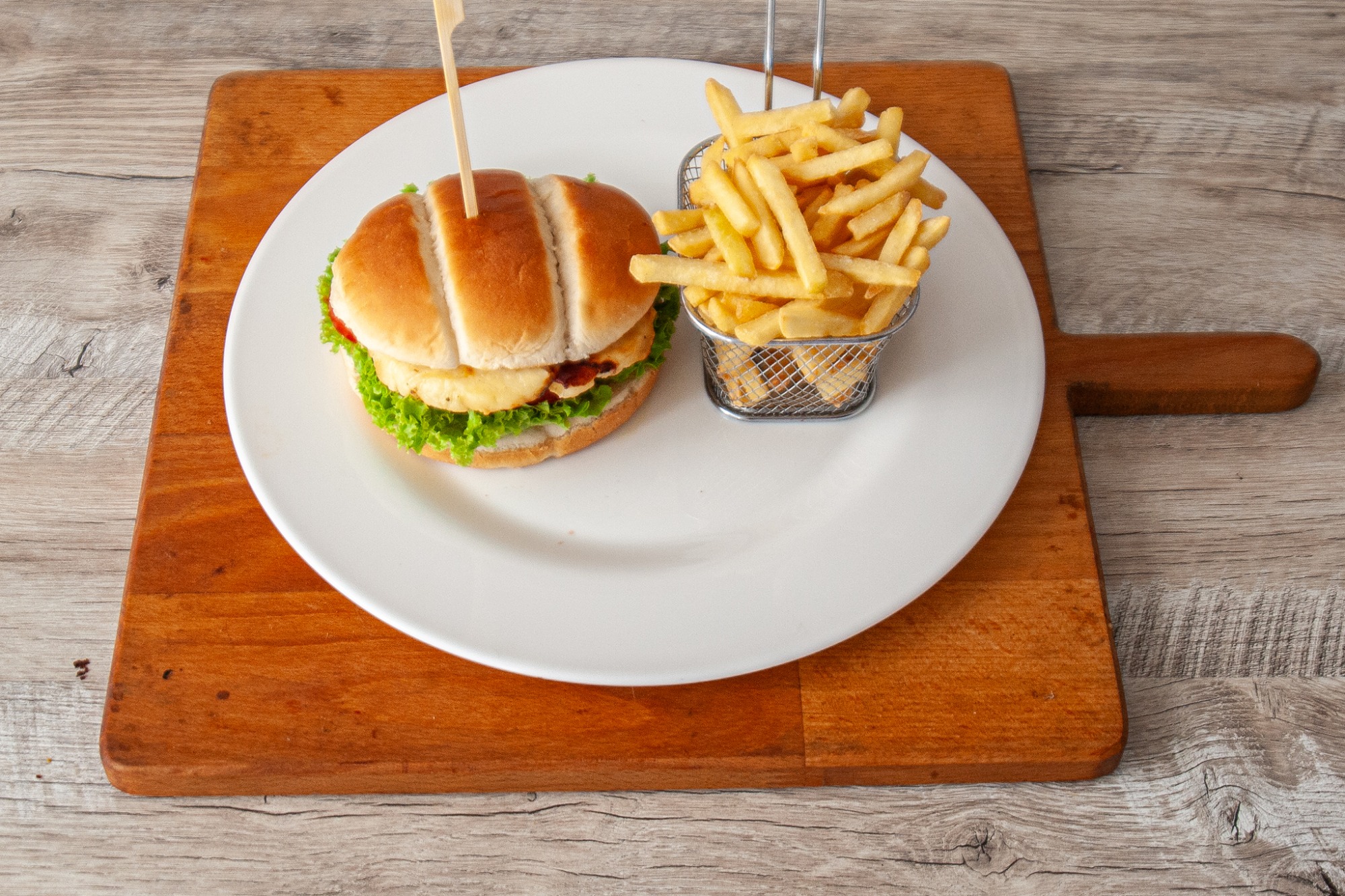 burger s grilovaným cyperským syrom Halloumi, omáčka z údenej papriky, rajčina, šalát, coleslaw šalát, hranolky