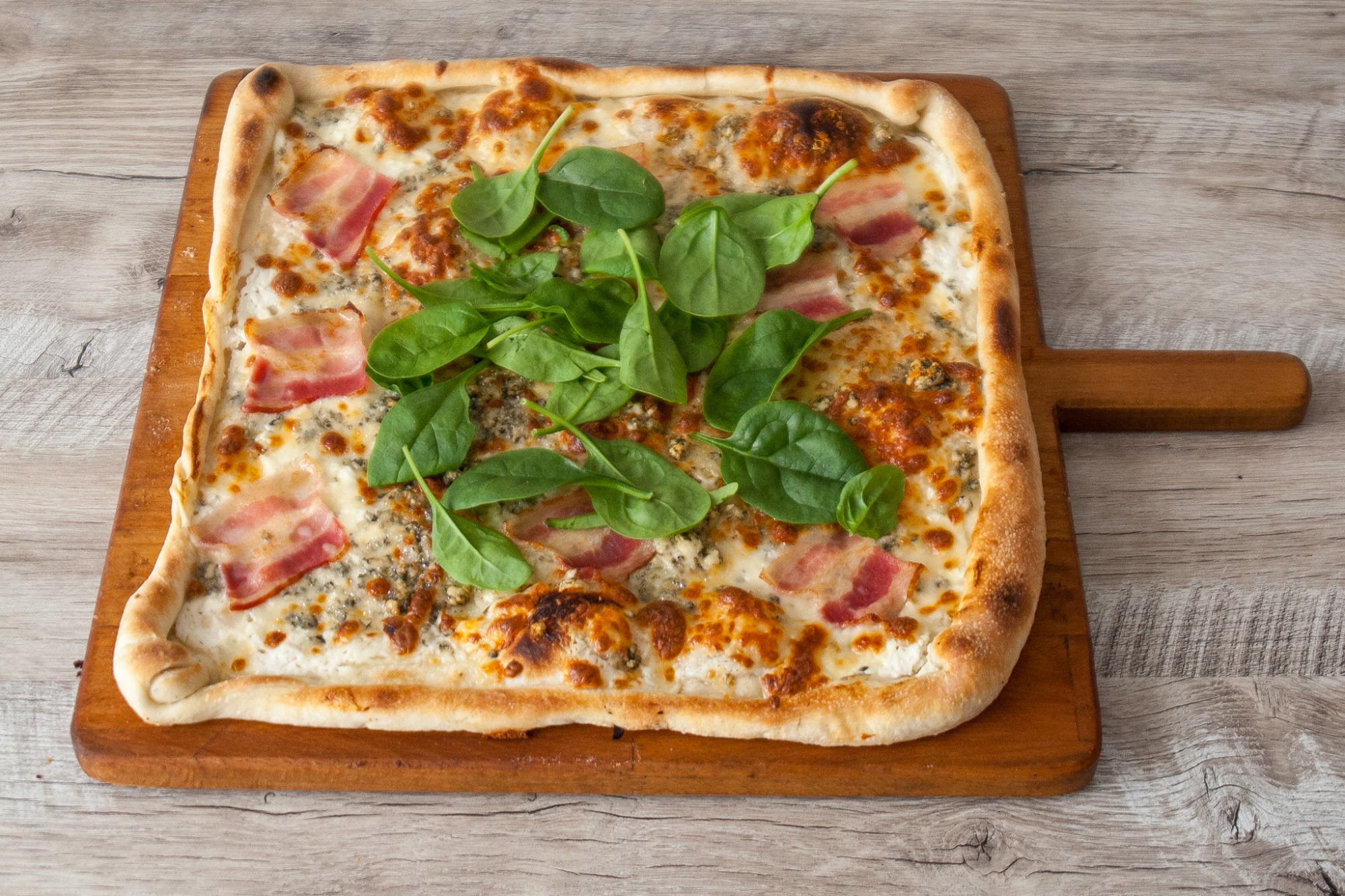 Pizza SPINACI – smotanový základ, mozzarella, špenát, syr niva, slanina
